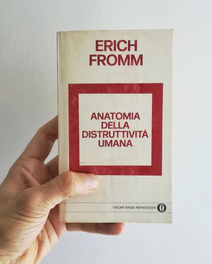 Mi sentivo nel giusto, ma quando però sono andato cercare la mia Glock semiautomatica di fabbricazione austriaca e alcuni caricatori, nello zaino che uso per andare in giro fingendomi una persona normale ho ritrovato questo vecchio libro (un’edizione Oscar saggi Mondadori di svariati anni fa che portavo sul cuore e che in più occasioni mi ha salvato deviando pallottole che mi sono state esplose contro durante gli addestramenti clandestini nei boschi): Anatomia della distruttività umana, di Erich Fromm. E quindi mi sono calmato, perché niente come l’ignoranza arma la mano. E, insisto, la filosofia deve essere insegnata a scuola.
