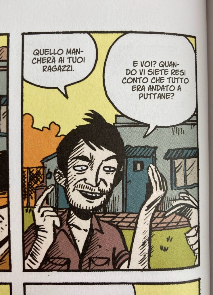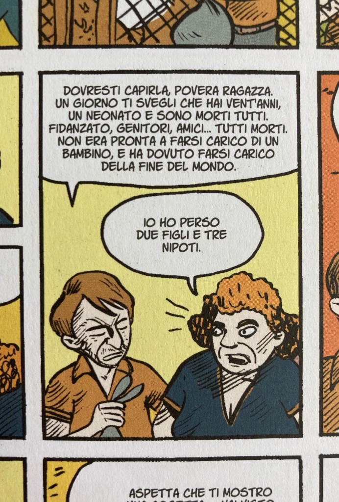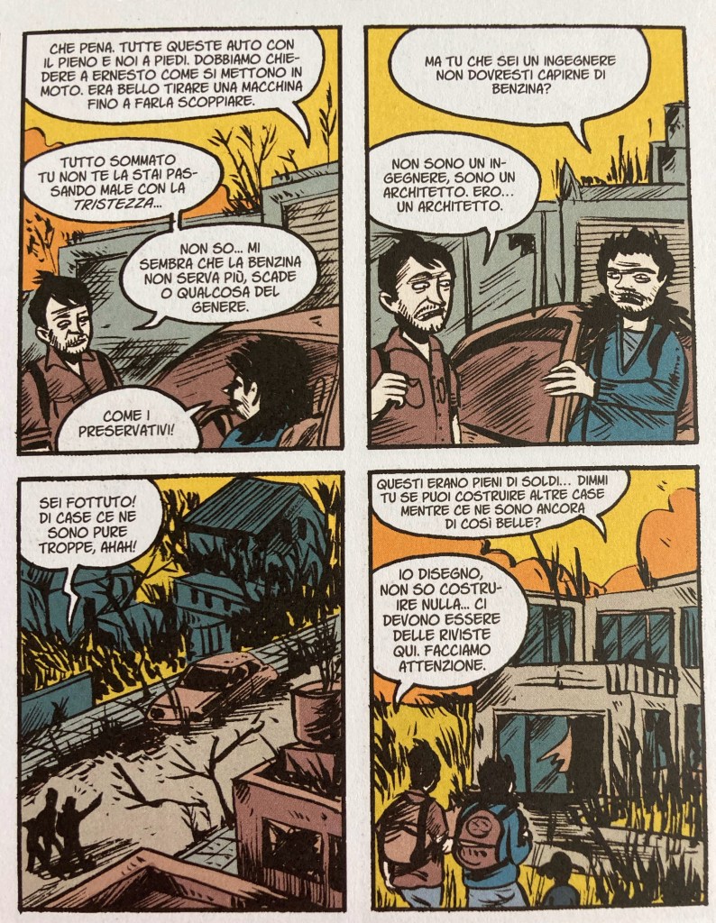 La palette dei colori è cupa, i tratti delle tavole sono duri, marcati, come certe scene della storia. Perché un mondo così fa paura. Una società di morti viventi, diresti, ma non zombie: gente che si lascia morire di tristezza e gente invece che usa ogni mezzo per sopravvivere, per progettare un futuro, per rifondare una società, per far nascere i figli. L’errore che possiamo fare è quello di guardare indietro e cercare di ricreare il mondo “com’era prima” perché non lo sarà mai più. Occorre invece ripensarlo alla luce di quello che abbiamo in mano e sulla scorta di ciò che le esperienze ci hanno insegnato.