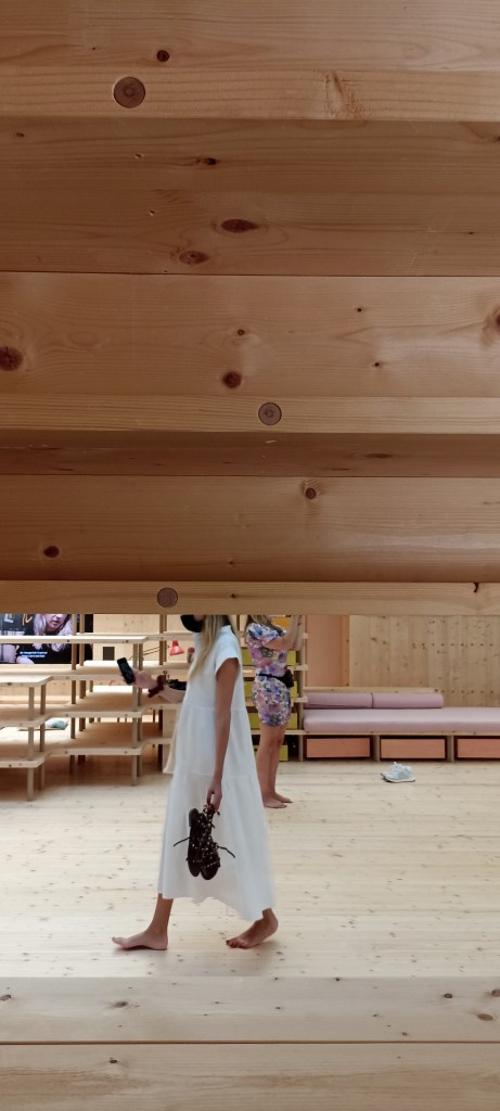 Vado a braccio, sfogliando il rullino dello smartphone. Il Giappone ha trasportato qui una casa destinata alla demolizione, smontandola pezzo per pezzo, accessori e poster alle pareti inclusi. La Spagna delle opere scartate ha fatto un’installazione prodigiosa (ne ho fatto un reel qui, su IG). L’enorme edificio della Germania, invece, all’apparenza completamente vuoto, era visitabile tramite app e realtà aumentata: posizionandosi su dischi di metallo in posizioni precise era possibile visualizzare sul proprio cellulare come sarà, secondo gli architetti, la casa del 2038, un posto sicuro, amichevole. Si parla di era della “New Serenity”: le persone, resesi conto che la competizione per l’accumulo di risorse non era più sostenibile, adotteranno un nuovo sistema basato sul principio di collaborazione. Si prevede così un mondo senza vincitori né vinti, senza eroi né eroine ma, allo stesso tempo, senza cattivi. Insieme, persone, Stati, istituzioni e aziende si saranno impegnate per i diritti fondamentali e avranno creato sistemi autosufficienti su base universale. Ogni componente, ogni materiale verrà definito e calcolato lungo tutto il suo ciclo di vita. Nel 2038 l’economia circolare avrà cambiato del tutto il modo in cui costruiamo. Internet pervaderà l’intera infrastruttura sociale e l’intelligenza artificiale non sostituirà l’uomo ma lo completerà.