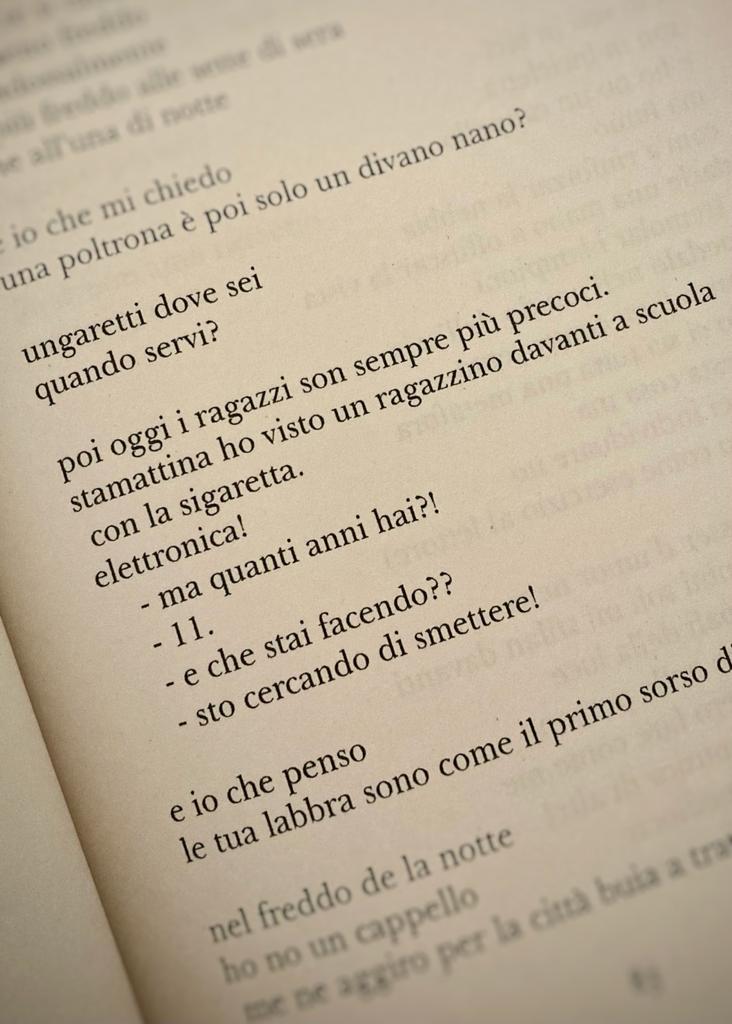 Scendo a vagare per la città di notte / a guardare l’espressione tipica delle ragazze che vann’ in bici con un vestitino corto / e mentr’un bus 60 viene superato da un bus 60 / mi sento scosso / da una panda della polizia ch’accende la sirena / solo per bruciare un semaforo rosso.