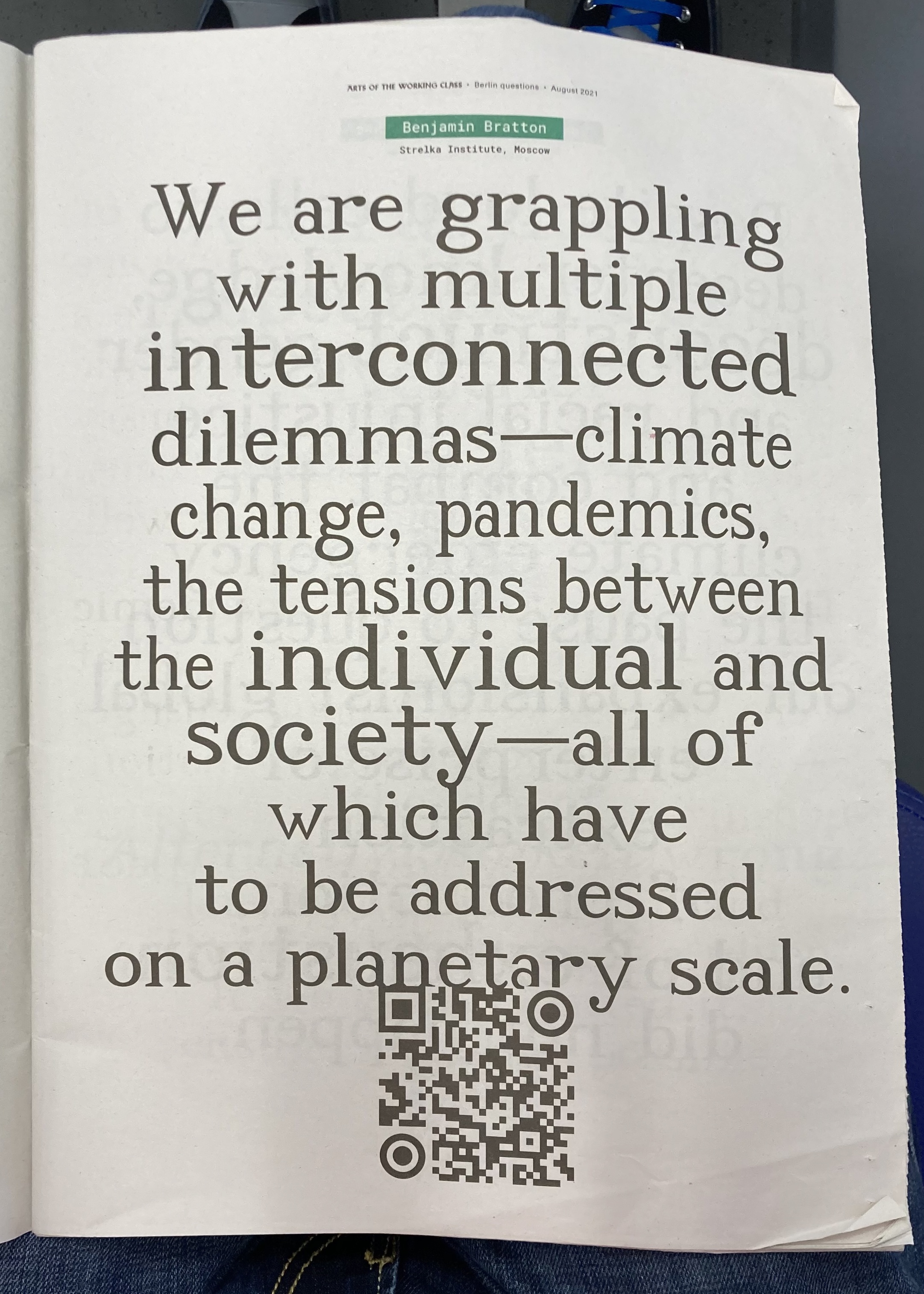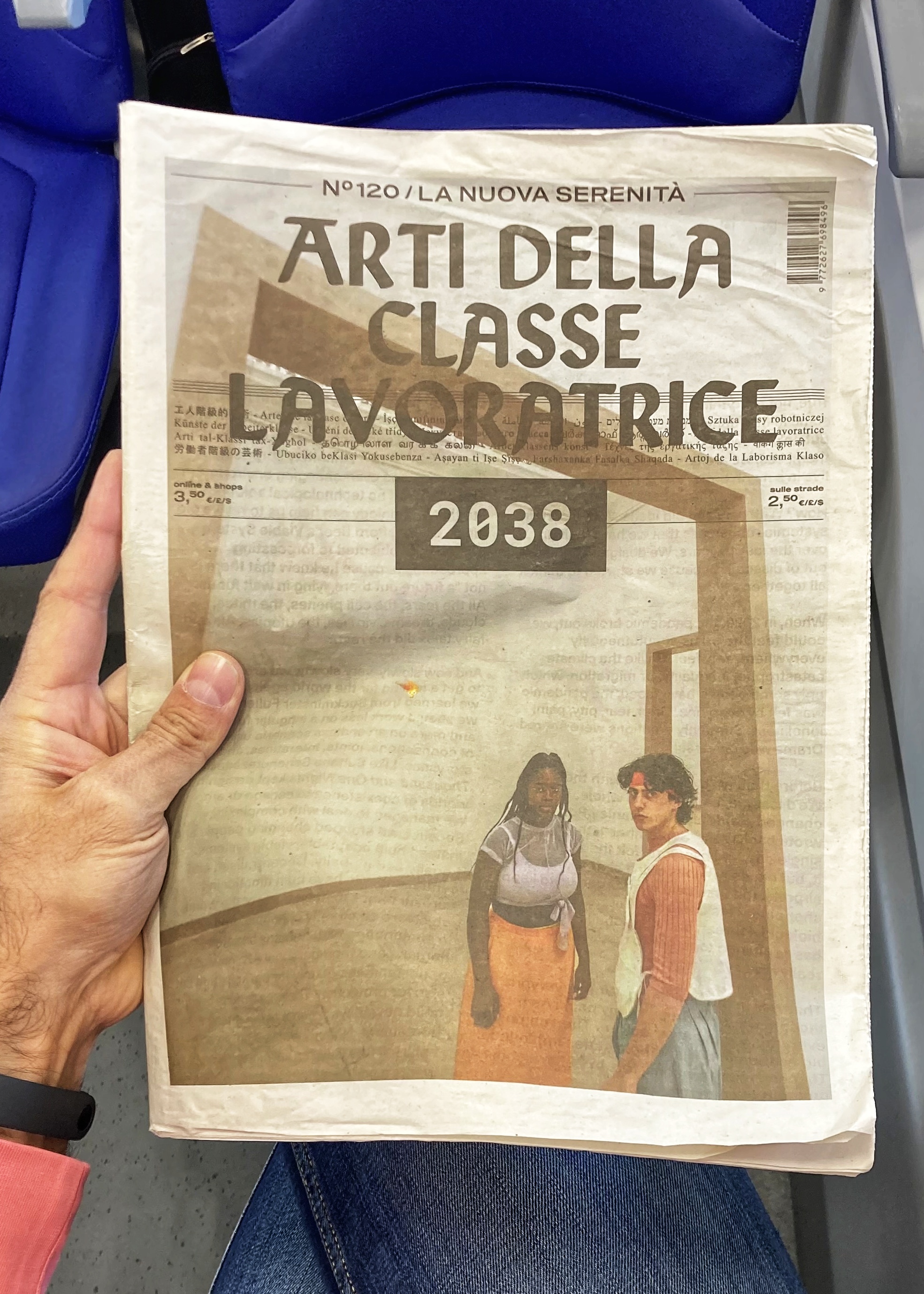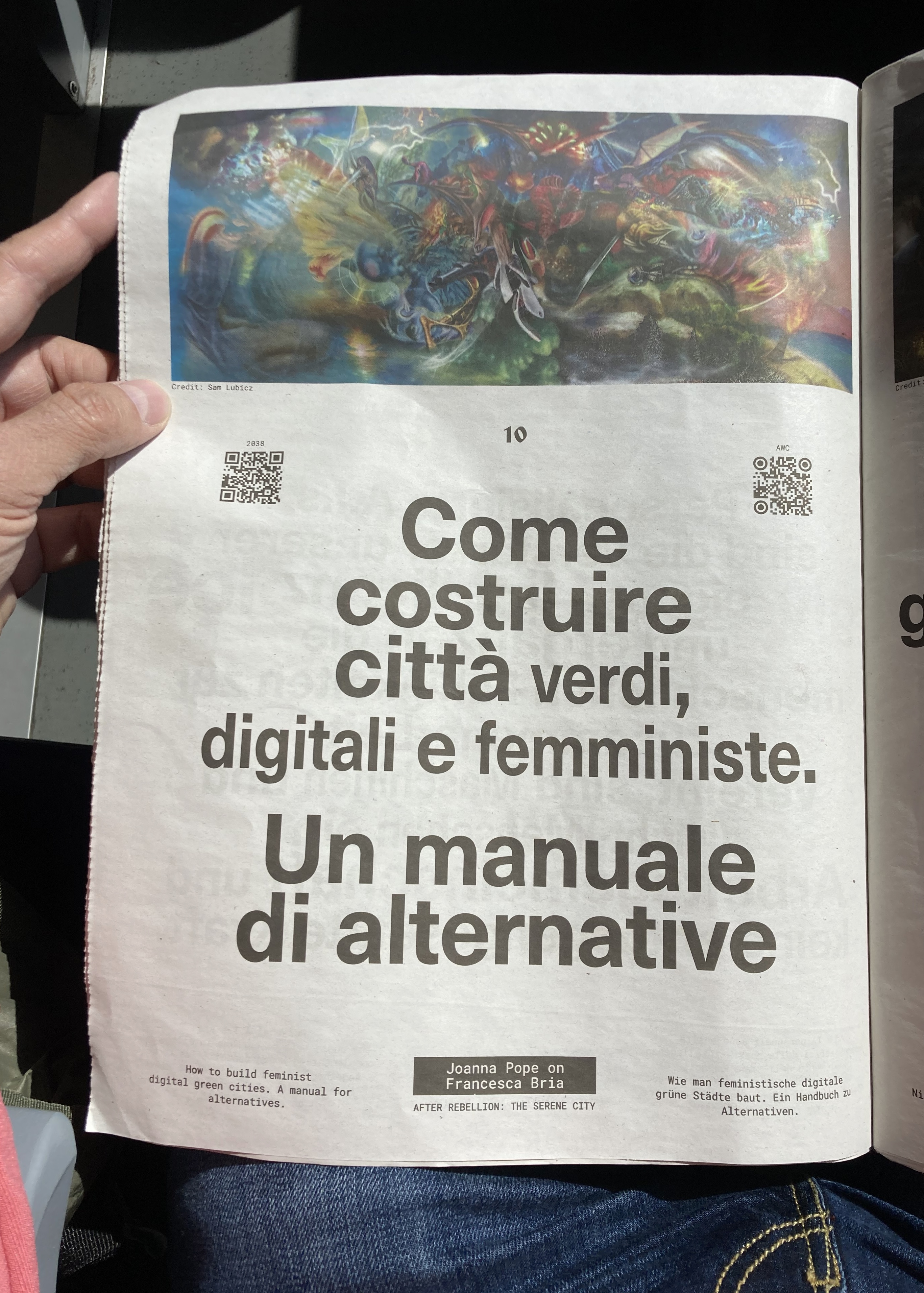 Amici e amiche, come state? Io così. Oggi però mi sono voluto dare una botta di positività leggendo questo non-so-come-chiamarlo giornale, dazebao, manifesto realizzato con la partecipazione di più di centocinquanta (solo quelli che ho contato io) tra artisti, ecologisti, architetti, scienziati, politici e scrittori. In realtà, non è solo qualcosa da leggere, è un’esperienza immersiva, con rimandi a video, schemi, animazioni, presentazioni, interviste e conversazioni sul futuro. Preparate la fotocamera col lettore di QRCODE. Il progetto è diviso in due parti: la prima si basa sul presente; capovolgendo la pubblicazione siamo nel 2038.