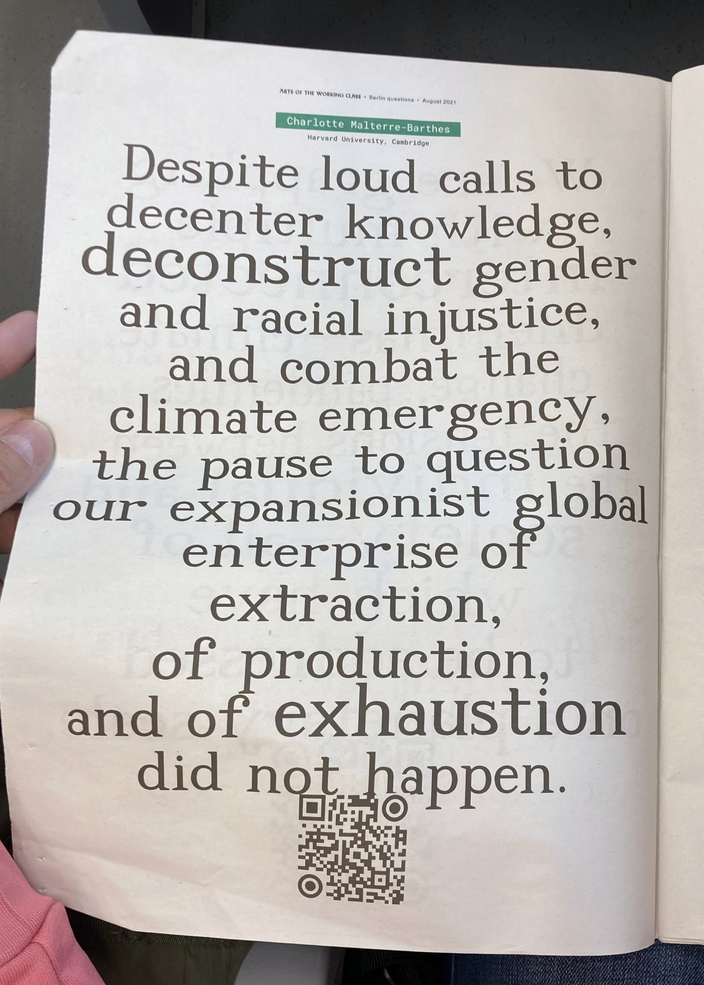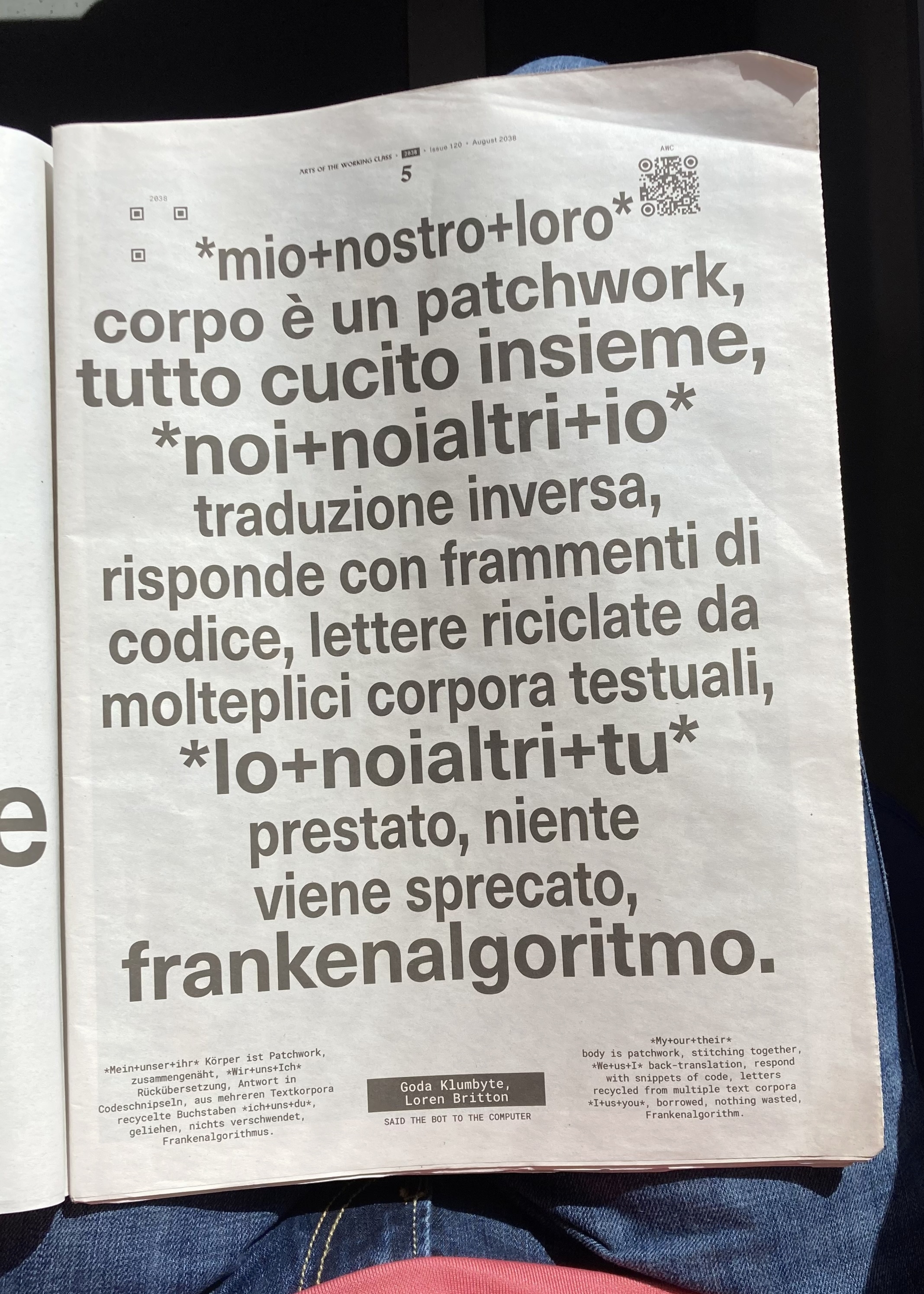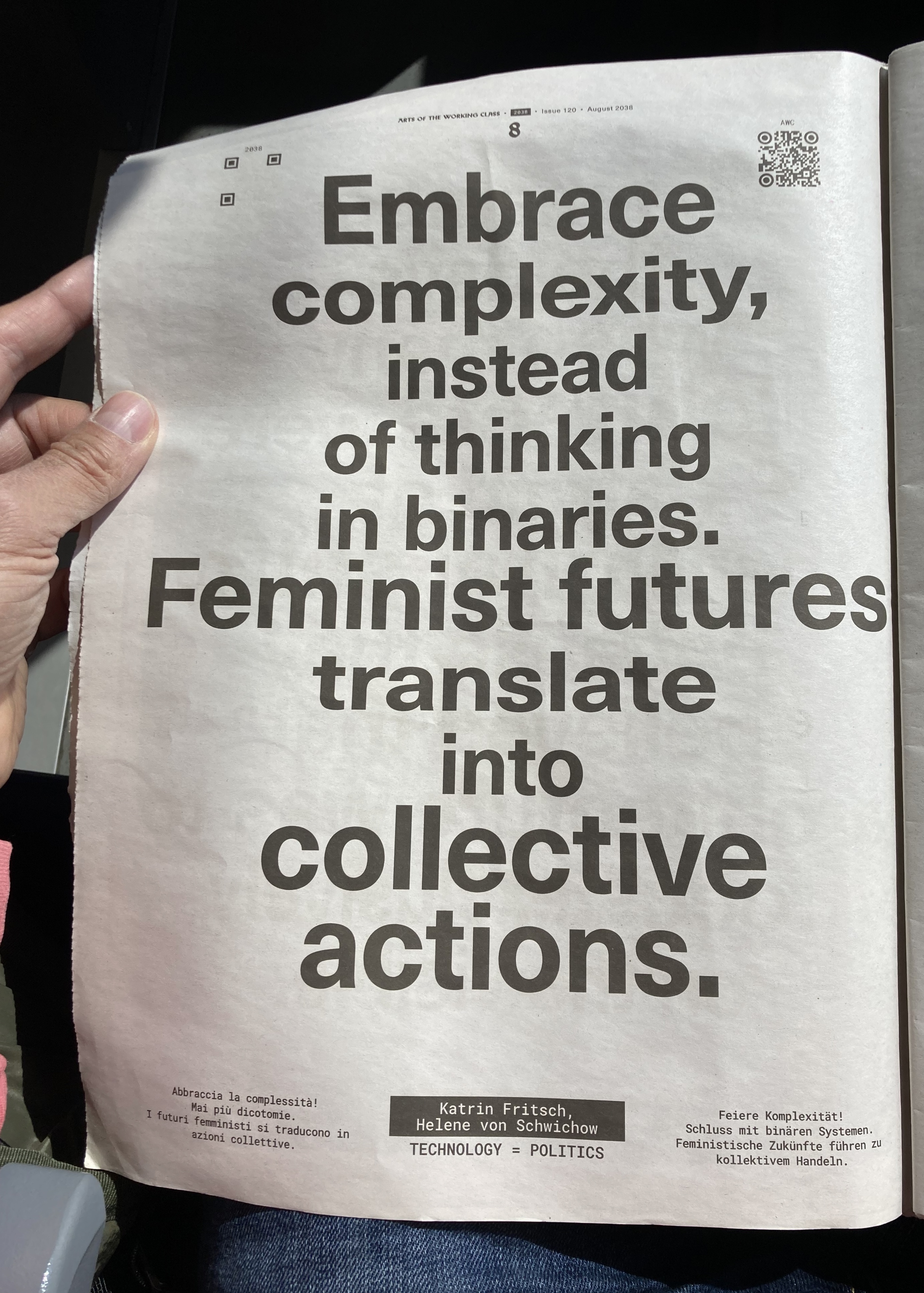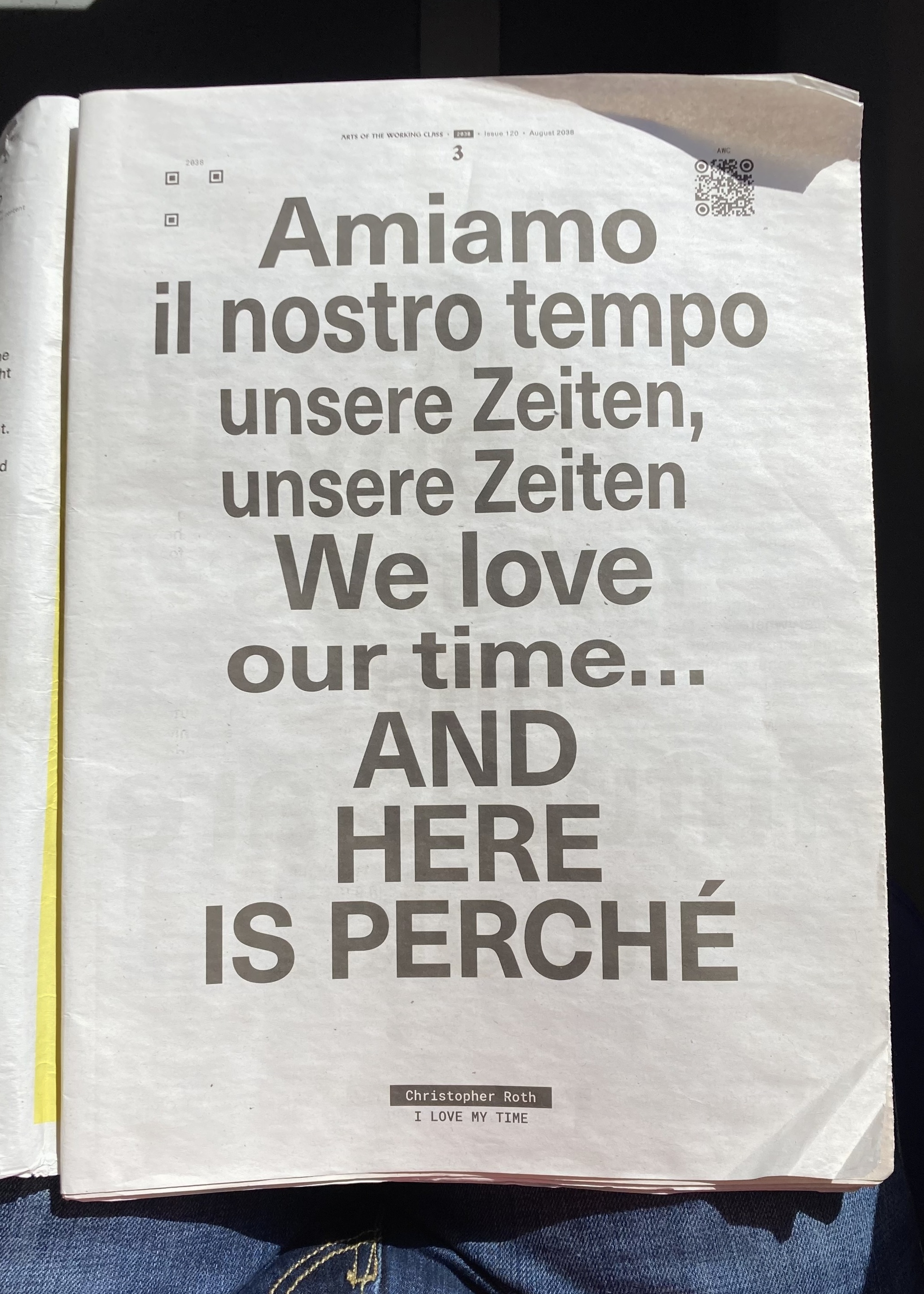 Amici e amiche, come state? Io così. Oggi però mi sono voluto dare una botta di positività leggendo questo non-so-come-chiamarlo giornale, dazebao, manifesto realizzato con la partecipazione di più di centocinquanta (solo quelli che ho contato io) tra artisti, ecologisti, architetti, scienziati, politici e scrittori. In realtà, non è solo qualcosa da leggere, è un’esperienza immersiva, con rimandi a video, schemi, animazioni, presentazioni, interviste e conversazioni sul futuro. Preparate la fotocamera col lettore di QRCODE. Il progetto è diviso in due parti: la prima si basa sul presente; capovolgendo la pubblicazione siamo nel 2038.