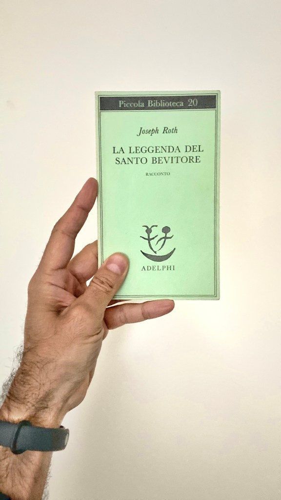 La leggenda del santo bevitore di Joseph Roth, qui nella classica edizione Adelphi, è un racconto di fallimenti, pentimenti e redenzioni, in un loop perpetuo che accompagna il nostro protagonista, il povero Andreas, fino a (NO SPOILER! vabbè ma si può capire, dai…). Olmi ne ha fatto un film, vincitore del Leone d’oro. Non ne ho un buon ricordo, mi pare. Il libro invece mi era piaciuto.