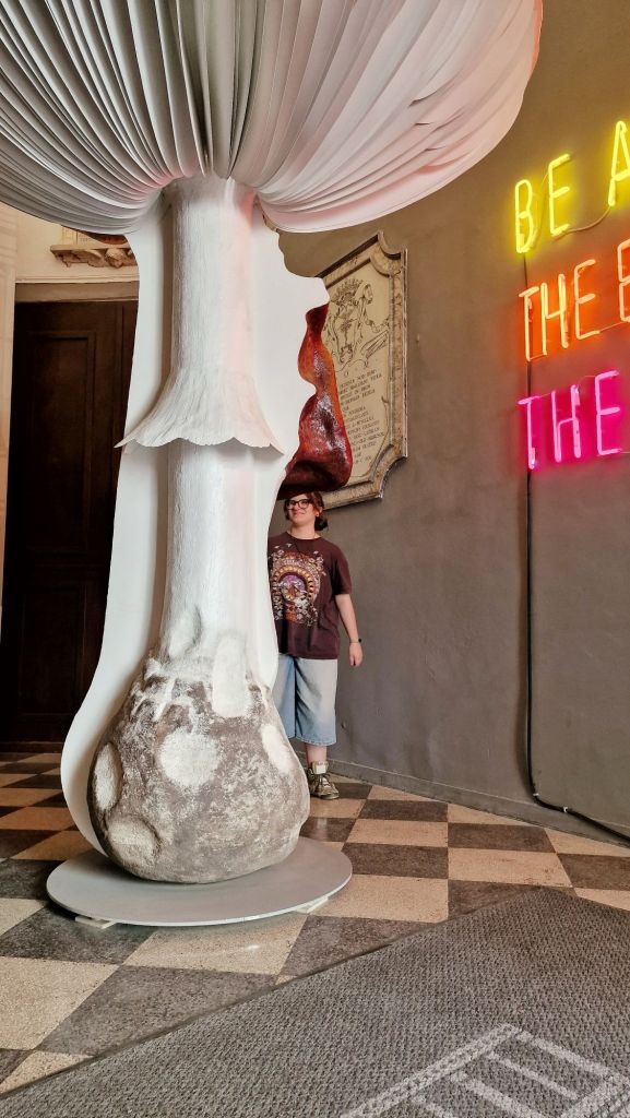 Ormai è uno standard: lo spettatore DEVE interagire con le opere o se no NON VALE. Interessante la Camera Picta di Piero Pizzi Cannella, le rifrazioni luminose e sonore di Alessandro Sciaraffa che produci tu stess* interagendo con il gong al centro della stanza, ma che male abbiamo fatto noi per meritarci funghi giganti tipo Gardaland o pannelli in plexiglass che rifrangono la luce? O stanzini con materassi buttati per terra con l’invito, fuori dalla porta, a “interagire” con chi ti sta vicino, amico o estraneo e vedere che cosa succede (tutto questo senza neppure delle telecamere a riprendervi, BAH!)? C’è anche una stanza in cui ti ci puoi stendere sui cuscinoni e lasciarti avvolgere da una proiezione estraniante in AI, che è cruda, disturbante, ma è la solita ciccia sul capitalismo, le classi sociali che si invertono, gli animali che si vendicano sull’uomo, e cose del genere. E che dire dei c.d. «bramantedoodles» di Nedko Solakov? Non vi voglio spoilerare altro. Prendetevi il vostro tempo e pensate: cosa potrei fare con diciotto euro? A TESTA EHI. Poi posso anche immaginare che l’artista si sia fatto anche pagare per fare degli sgorbietti sulle pareti delle scale, eh.