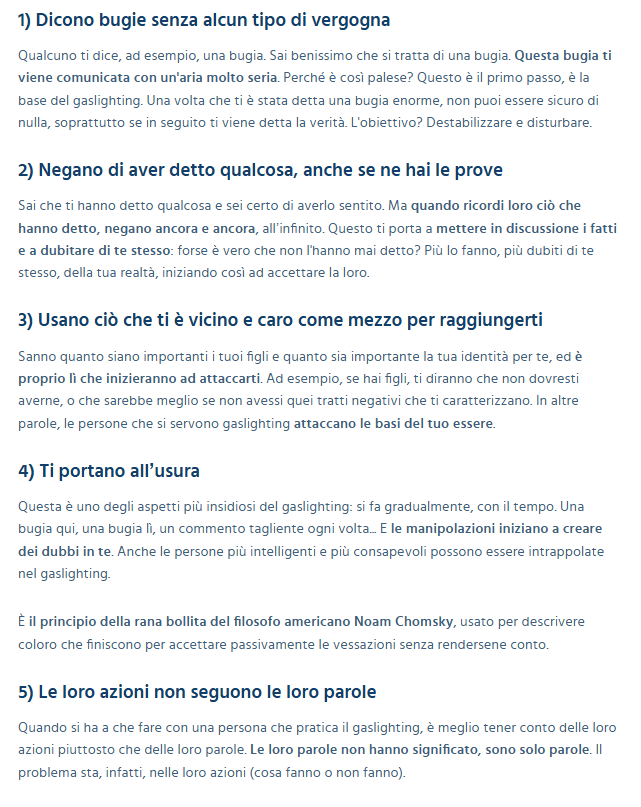 - In famiglia: un genitore potrebbe dirti che “non ricordi correttamente” un evento della tua infanzia, sminuendo le tue emozioni e alterando il ricordo per adattarlo alla propria narrazione:;