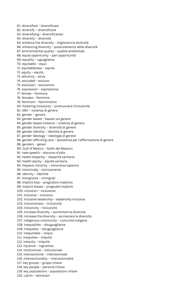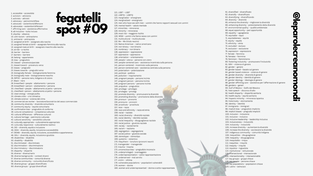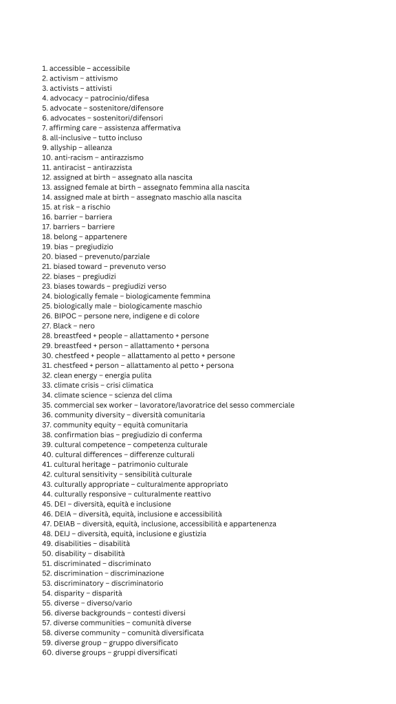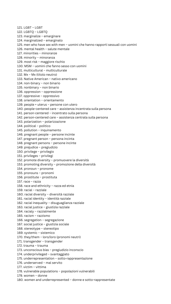 Dopo una fase di “non si può dire più niente”, in cui si è cercato piano piano di lavorare sul linguaggio per essere più inclusivi e rispettosi delle minoranze, ci affacciamo nell’Alto Bullo-machismo, dove l’appena insediato Governo Milei ha reintrodotto termini come “idiota”, “imbecille” e “ritardato” per riferirsi a portatori di disabilità mentale. In questo scenario, il Governo USA ha rilanciato, stilando un elenco di termini che devono SPARIRE da siti e documenti federali e non essere usati MAI più, tra questi “nero” (bianco invece è Ok), “allattamento” (?), “crisi climatica”, “patrimonio/sensibilità culturale”, “disabilità”, ‘diversità”, “discriminazione”, ma anche “razzismo”, “inquinamento”, “minoranza” appunto. E anche “donna”. Qual è il vostro preferito? Vorreste aggiungerne altri? Ve li appoggio qui, se volete darne lettura. Ci risentiamo a breve per commentarli insieme. Ciao.