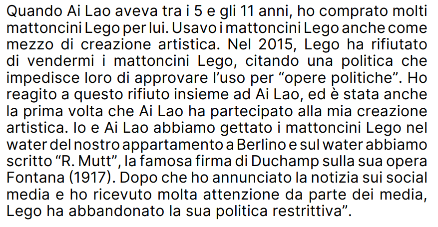 Ciao amiche e amici, come state? E chi siete? Chi sono io? (Evitate risposte impulsive e ficcanti formate da due parole (3, 5) la prima forma aferetica di aggettivo dimostrativo, la seconda membro maschile (volg.). Negli ultimi tempi, cerco inutilmente di capire il perché dei fenomeni sociali, non è facile quando li guardi e basta e nessuno ti sa (o ti vuole) spiegare che cosa succede. Chi invece ti fa comprendere (e soffrire) le dinamiche contemporanee è Ai Wei Wei, con la sua tagliente, dissacrante ironia. La sua personale, Who I am?, ti guarda dentro e ti smonta, pezzo per pezzo: Ai Wei Wei è un artista cinese, attivista e dissidente. E, a quanto pare, anche un esperto di LEGO.