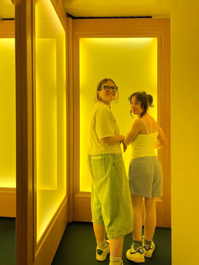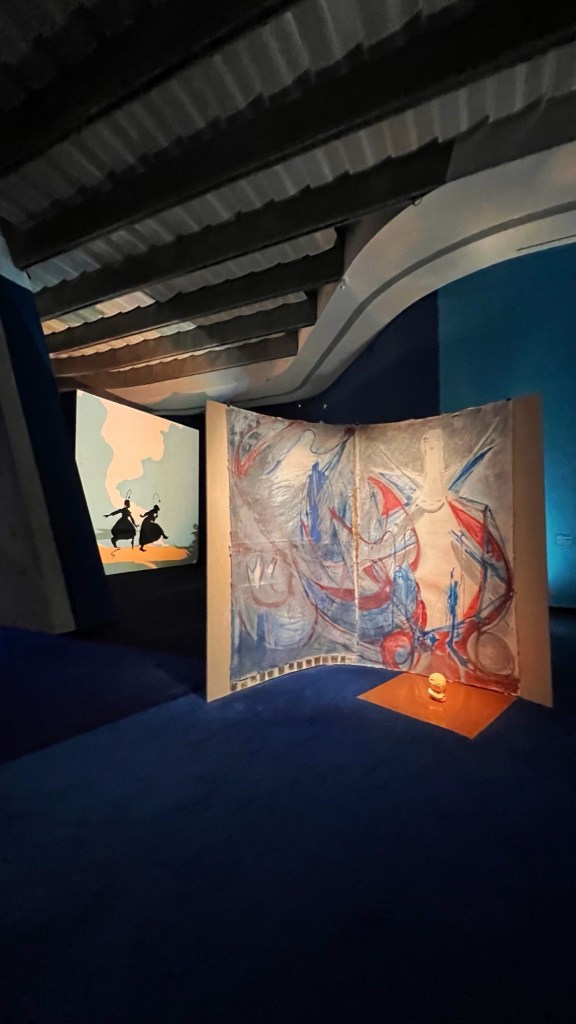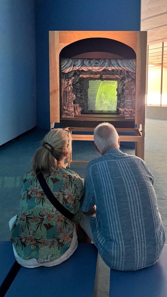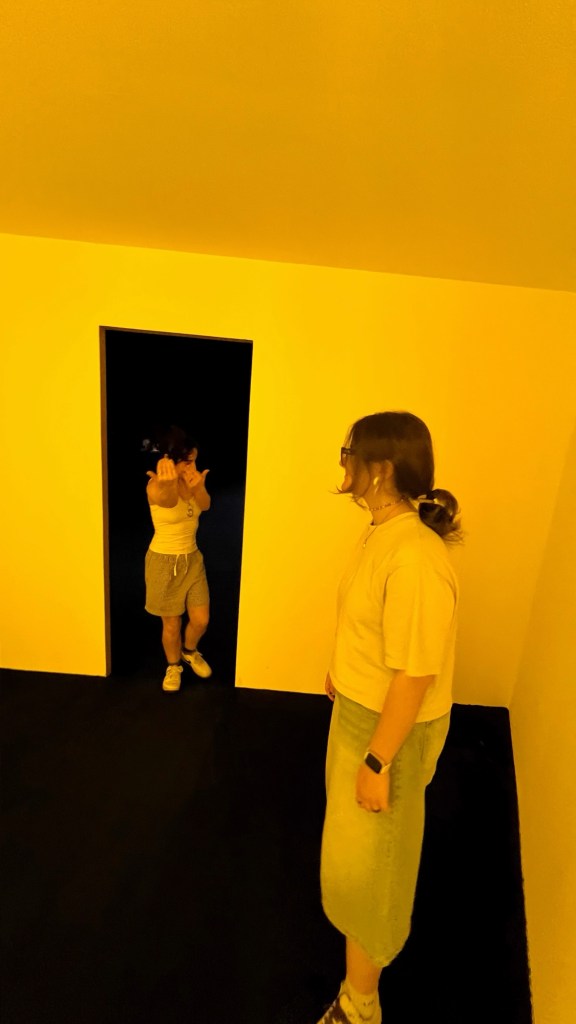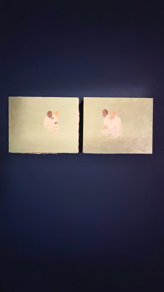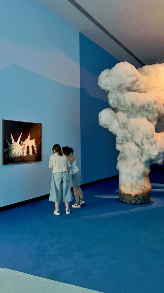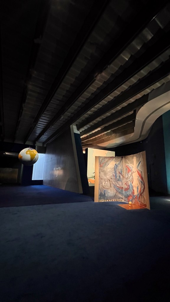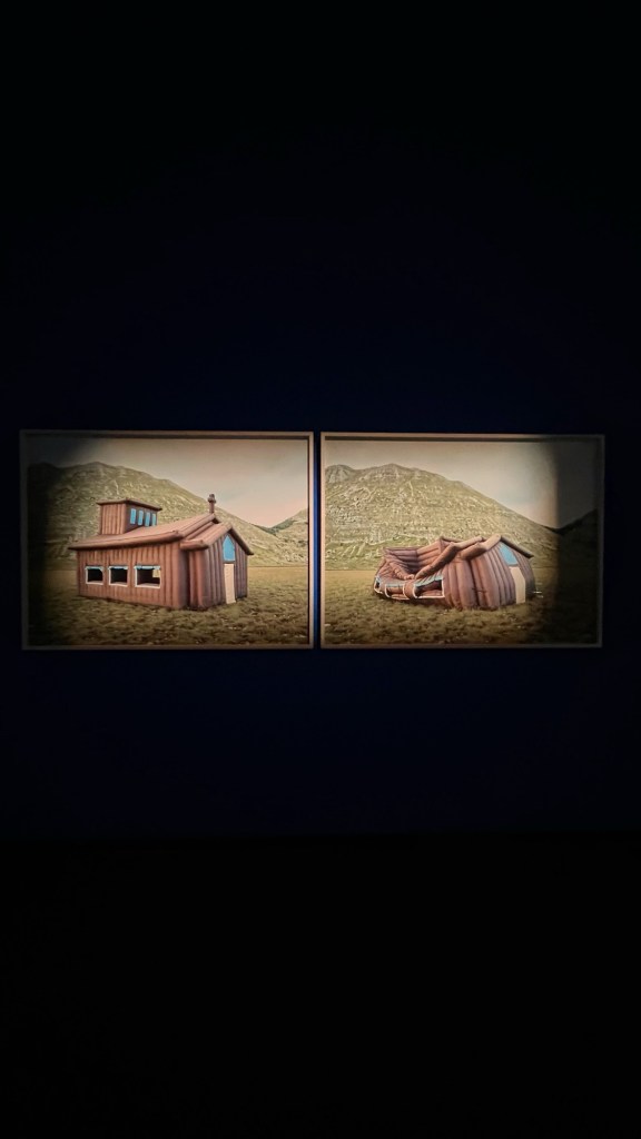 Ne è un esempio il modo in cui le luci e i colori sono utilizzati per destabilizzare la nostra percezione. Ogni sala è costruita come una scena teatrale – talvolta intima, talvolta grottesca – in cui l’opera diventa personaggio e lo spettatore, suo malgrado, coprotagonista. Lo spazio è trattato come una partitura visiva e cromatica. Pareti verdi bottiglia, corridoi neri vellutati, dettagli di arredo volutamente stranianti: una sedia rovesciata su sé stessa, una tenda che non conduce da nessuna parte… Ogni elemento è progettato per disorientare, ma anche per accogliere lo sguardo in uno spazio altro.