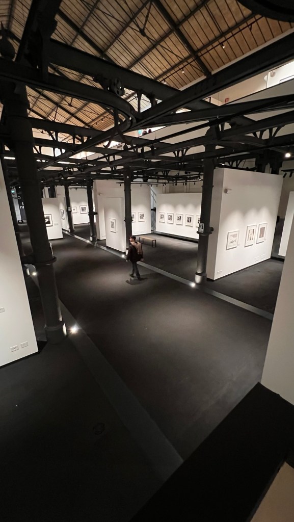 Ma lasciamo stare. Il Centro apre al Mattatoio di Testaccio, nel Padiglione 9D — ex macello ottocentesco che dal 1975 è dismesso e che, con la flemma tutta romana, si sta convertendo in Città delle Arti. Le originarie strutture in ferro che servivano come binari per il trasporto delle carni creano una piacevole struttura portante che sorregge anche un ballatoio, aumentando così la superficie espositiva. Poesia involontaria dell’architettura: dove un tempo scorrevano carcasse bovine, ora scorrono visitatori con la borraccia e l’audioguida. Il progresso è questo: STACCE.